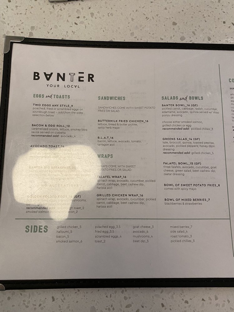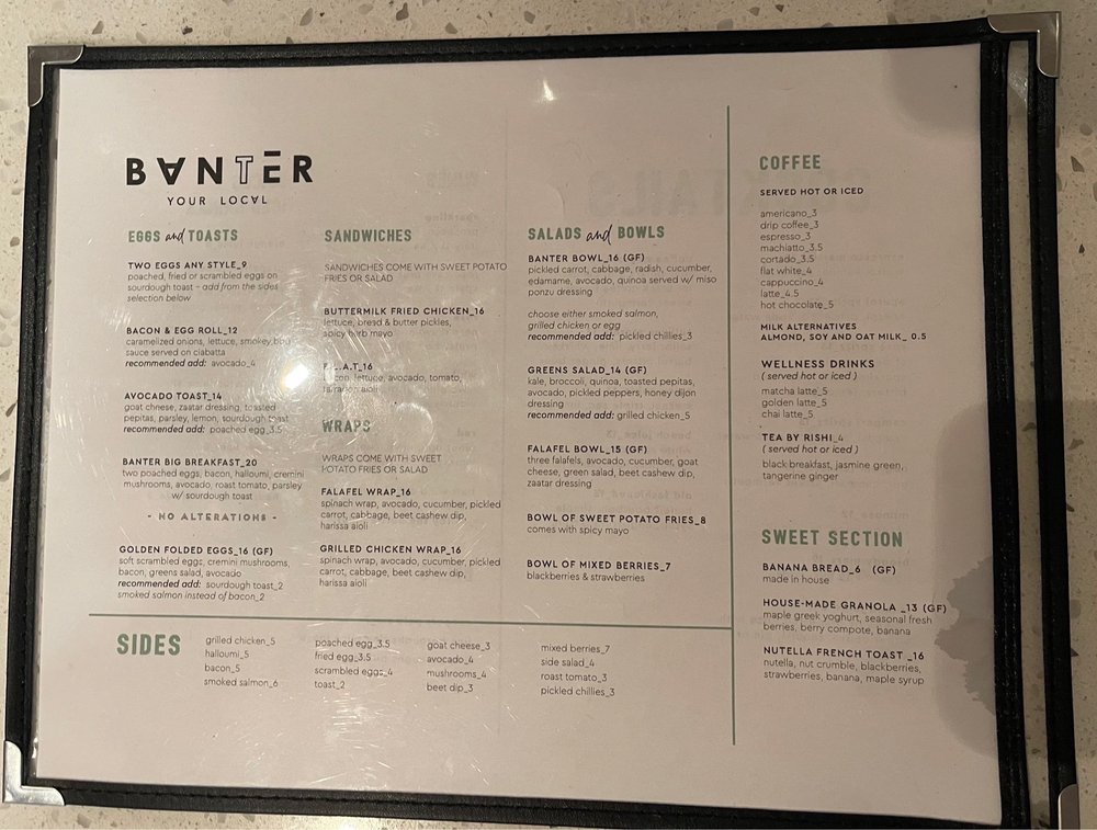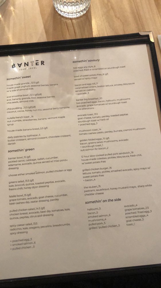 The menu at Banter features delicious dishes like the Avocado Toast, Banana Bread, Banter Bowl, and Big Breakfast, all made with fresh, high-quality ingredients. Customers rave about the flavorful dishes, with standout items like the Chicken Salad Wrap, Golden Eggs, and Smoked Salmon Toast receiving high praise.